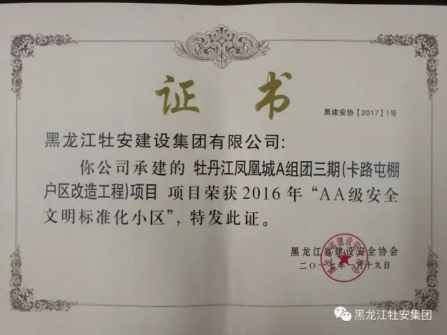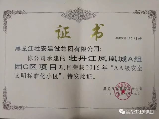 日前,由我公司承建的牡丹江鳳凰城A組團(tuán)三期(卡路屯棚戶區(qū)改造工程)項(xiàng)目和牡丹江鳳凰城A組團(tuán)C區(qū)項(xiàng)目,被省建設(shè)安全協(xié)會評為2016年度“AA級安全文明標(biāo)準(zhǔn)化小區(qū)”。張化民、李強(qiáng)分別被授予“全省建設(shè)安全管理優(yōu)秀項(xiàng)目負(fù)責(zé)人”稱號。對獲得榮譽(yù)的同志表示祝賀的同時(shí),也希望他們在今后的工作中戒驕戒躁再接再厲,充分發(fā)揮典范作用,繼續(xù)做好施工現(xiàn)場安全文明標(biāo)準(zhǔn)化工作,加強(qiáng)安全生產(chǎn)和文明施工管理,推動我公司安全文明標(biāo)準(zhǔn)化工作提升水平,再上新臺階。